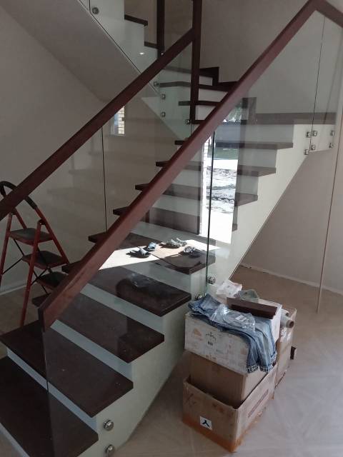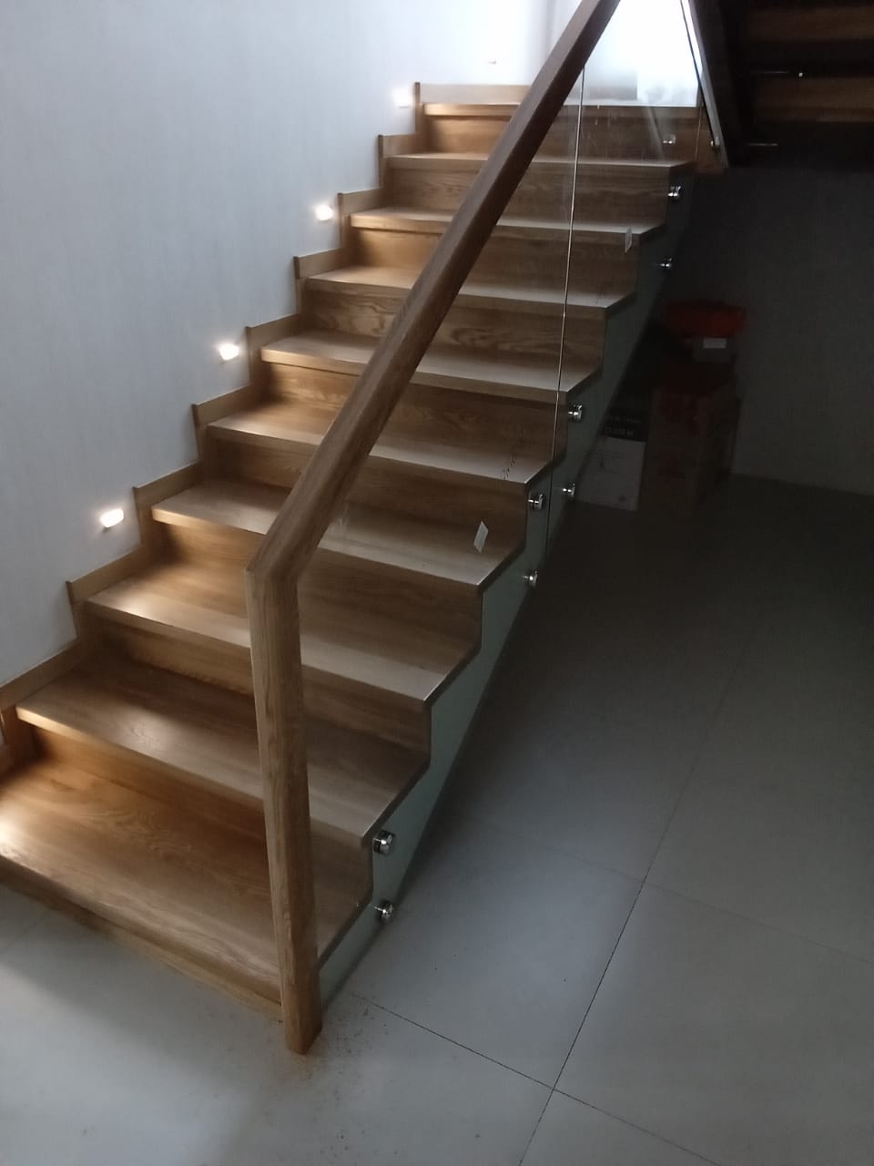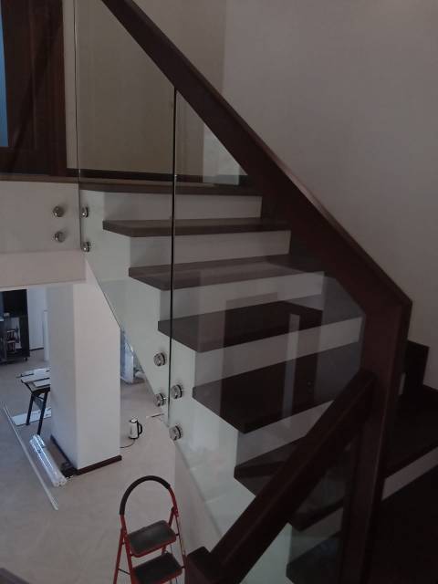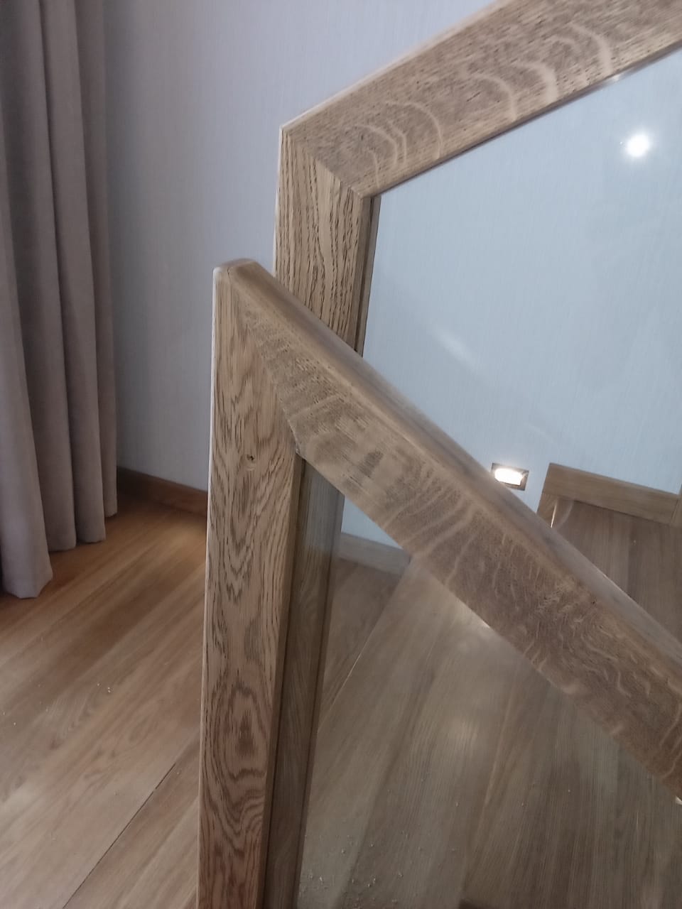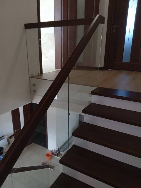 Перила из закаленного стекла толщиной 10 мм. и боковым креплением на стеклодержатель шпилька М16х205 мм, для стекла 8-40 мм, с возможностью регулировки выноса до 65 мм, для торцевого крепления стекла, полированный, литой, точечный. Поручни из натурального дуба. Покраска в цвет заказчика.