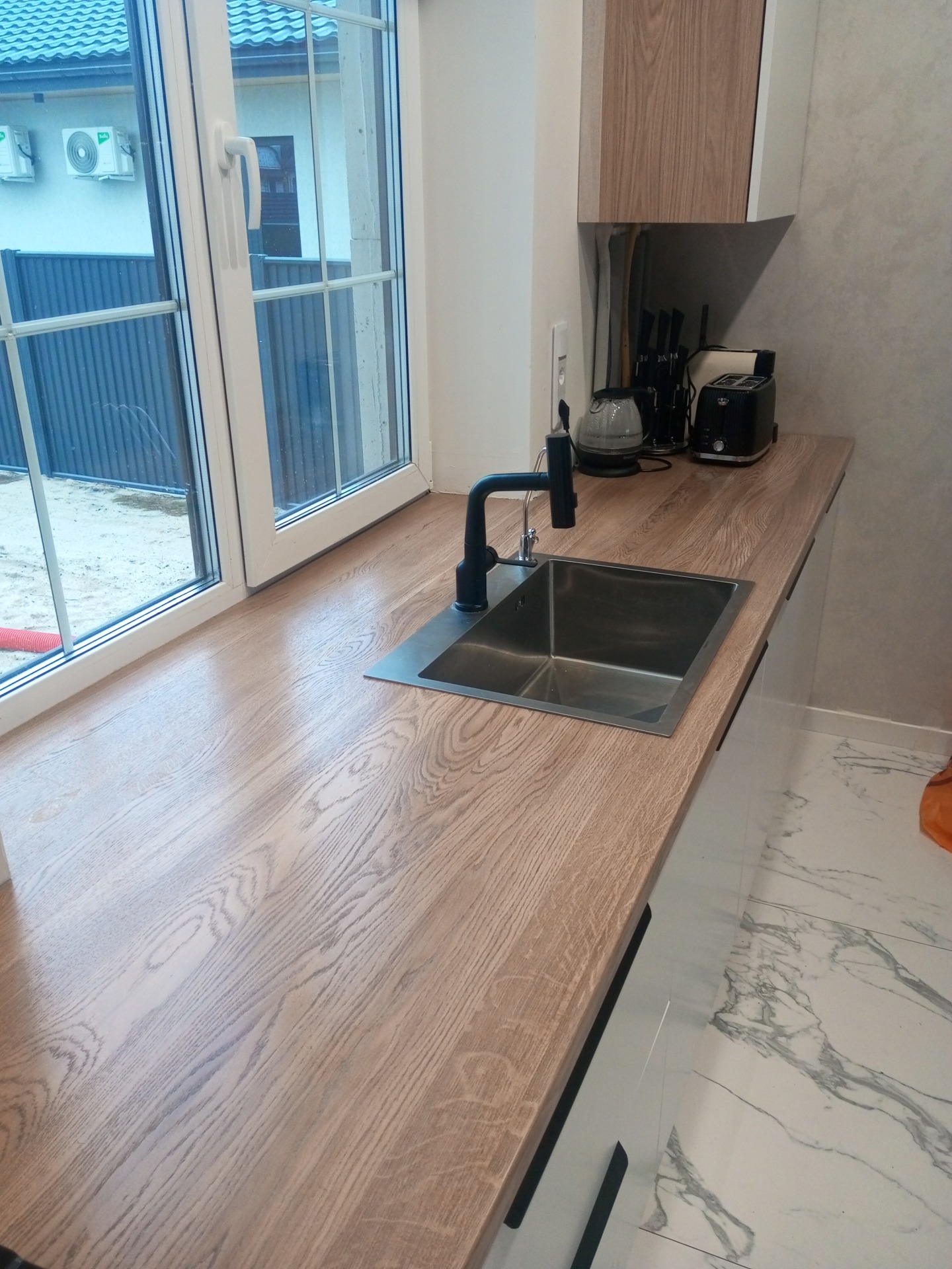 Предлагаем столешницы из дуба толщиной 40 мм. Столешницы изготавливаются из цельно ламельного массива - сорта экстра (без сучков). Столешница отшлифована и готова под покраску. Возможны варианты покрытия лаком. Цвет тонировки выбирается по согласованию. Для предотвращения деформаций низ столешницы фанерован влагостойкой фанерой.