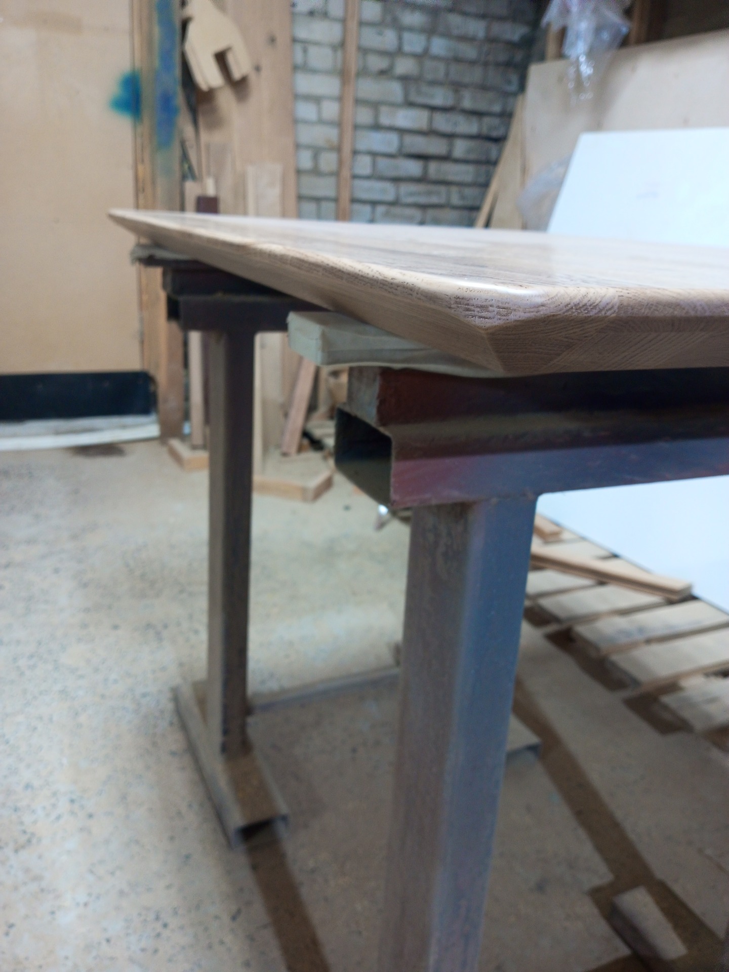 Столешницы изготавливаются из цельно ламельного массива дуб кантри с (сучком). Нижние ребра скошены, углы закруглены. Возможны варианты покрытия лаком. Цвет тонировки выбирается по согласованию.